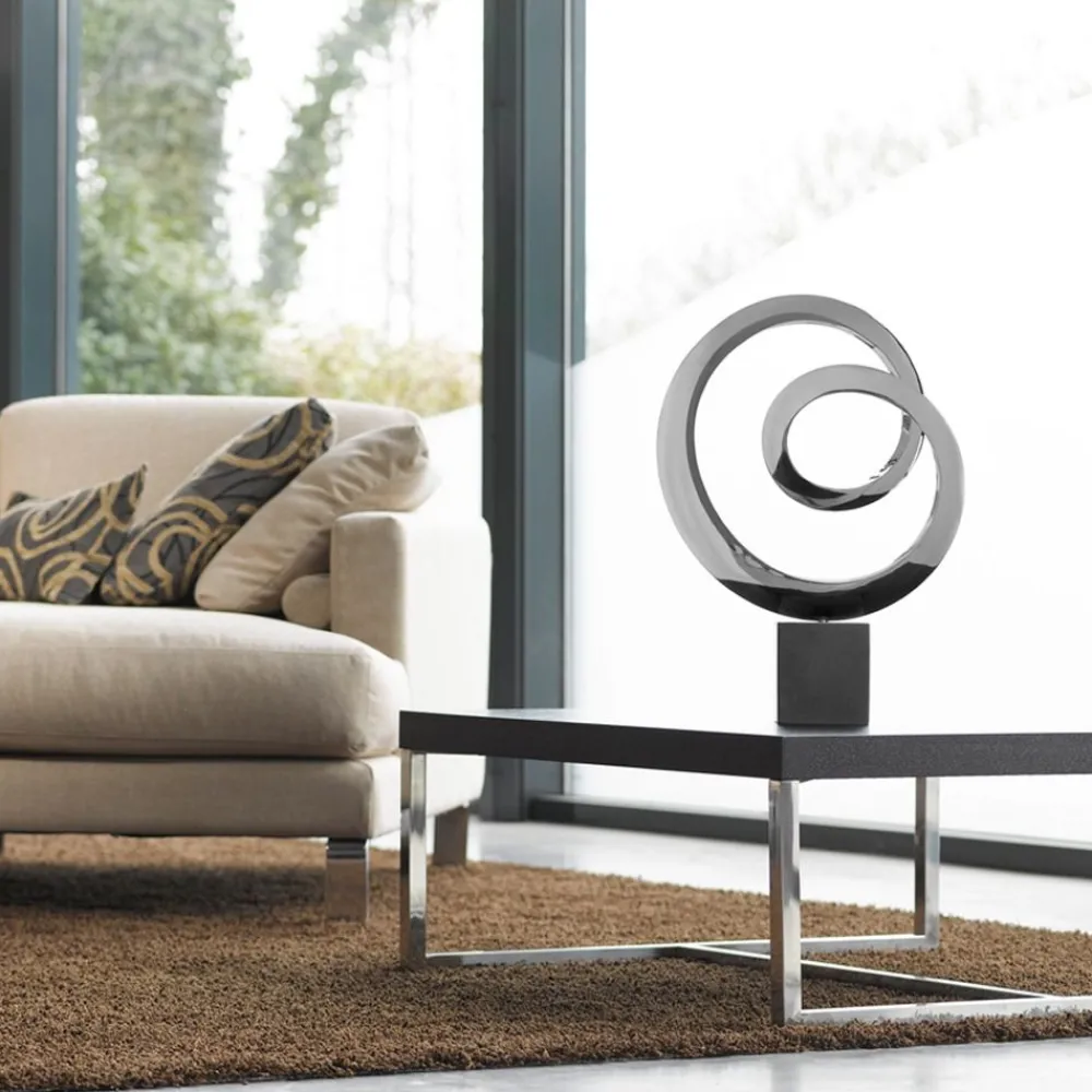 Overview: Outstanding in style this Ellipse contemporary sculpture is perfect as a centrepiece in the modern home. This sculpture is finished in wonderfully sleek polished stainless steel with a black granite base. Irregular structure, colour and shape, cut surfaces not rectangular! Exclusive contemporary art – when viewed closely you will see the marks of handcraft and individualities of every piece.