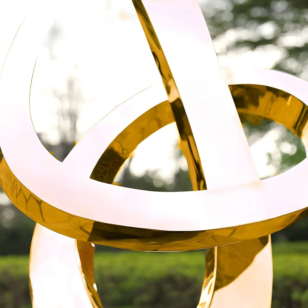 Introducing the Orbital Motion Stainless Steel Outdoor Sculpture: a stunning work of contemporary art that combines elegance with dynamic design. Crafted from premium stainless steel, this piece features gracefully intertwining forms that convey a sense of movement and balance. The polished gold finish enhances its reflective qualities, creating a mesmerising interplay of light and shadow that shifts as the viewer changes perspective. Its abstract nature allows for personal interpretation making it a captivating centrepiece that sparks conversation and imagination.