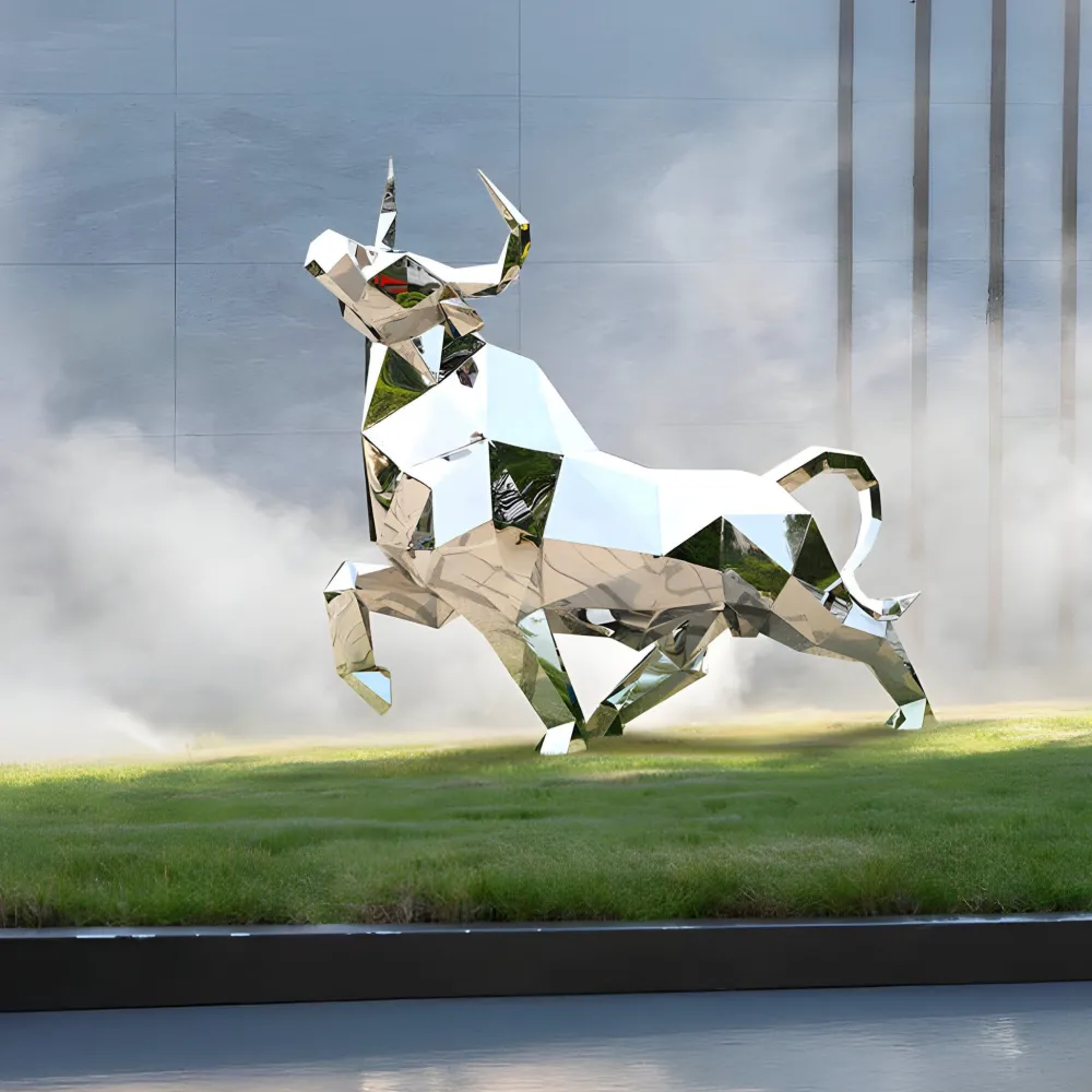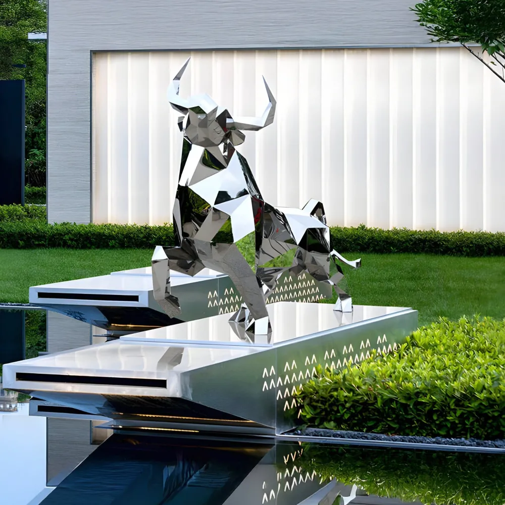 Introducing the Grand Bull Geometric Garden Sculpture: a masterpiece that combines contemporary artistry with meticulous craftsmanship. This design transforms natural elegance into a striking geometric form, with angular facets that reflect light dynamically, creating mesmerising effects that shift with the environment. Constructed from premium stainless steel, its sleek polished finish adds a layer of sophistication making it an eye-catching addition to any space.