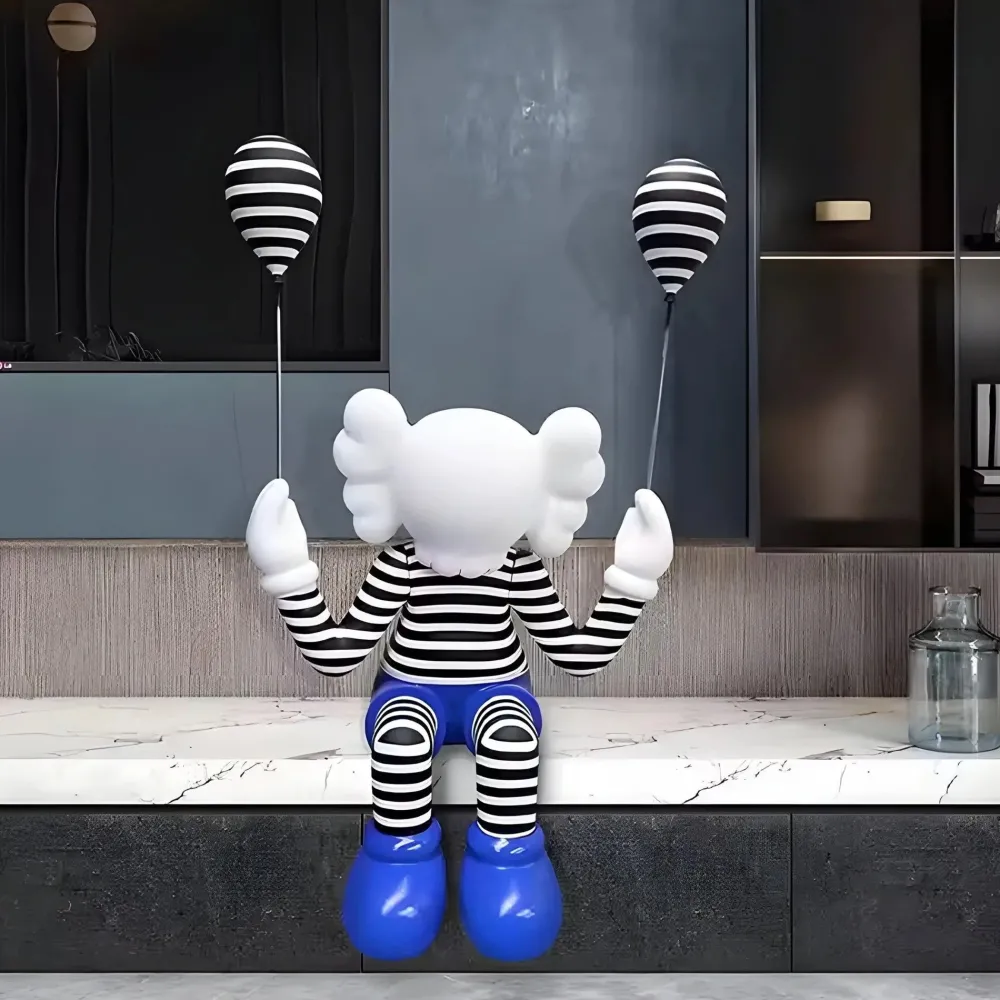 The Lucify Up Sculpture captures the charm and elegance of theatrical expression. Crafted from high-quality resin this seated figure features bold blue shoes and a striking striped outfit reminiscent of classic mime artistry. Its expressive posture and intricate sculpting add depth and emotion transforming it into a visually compelling statement piece. The contrast between its vibrant blue accents and monochrome stripes enhances its presence while the polished resin finish interacts with light to highlight its sculptural form.
