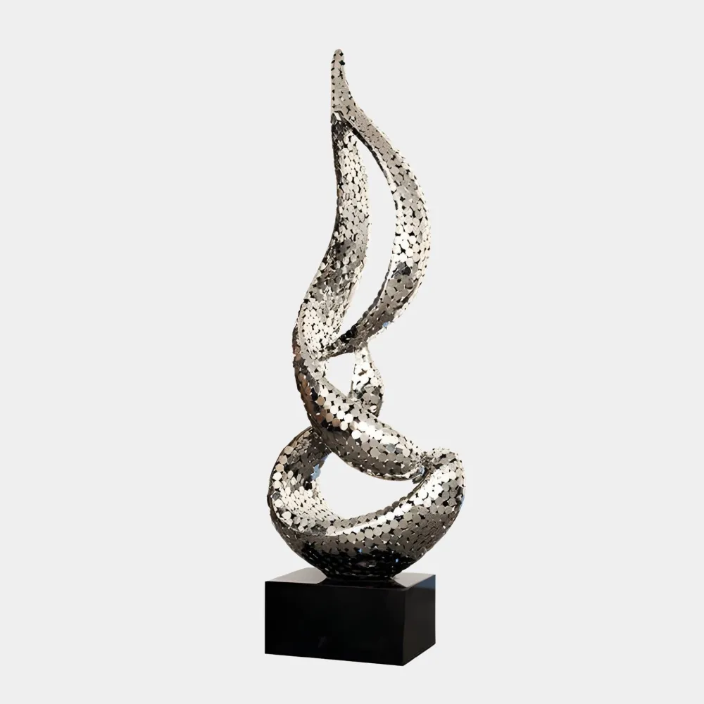 Introducing the Eternal Flame Stainless Steel Sculpture: a perfect fusion of modern elegance and artistic expression. Its abstract form combines sharp angles with flowing curves, creating a visually dynamic piece that captivates from every perspective. Crafted from high-quality stainless steel with a polished finish, this sculpture reflects light beautifully, enhancing its surroundings and inviting viewers to explore its intricate design. Its contemporary aesthetic makes it an eye-catching centerpiece in any environment.