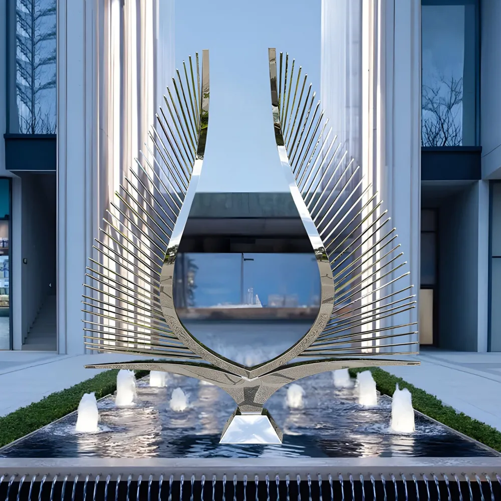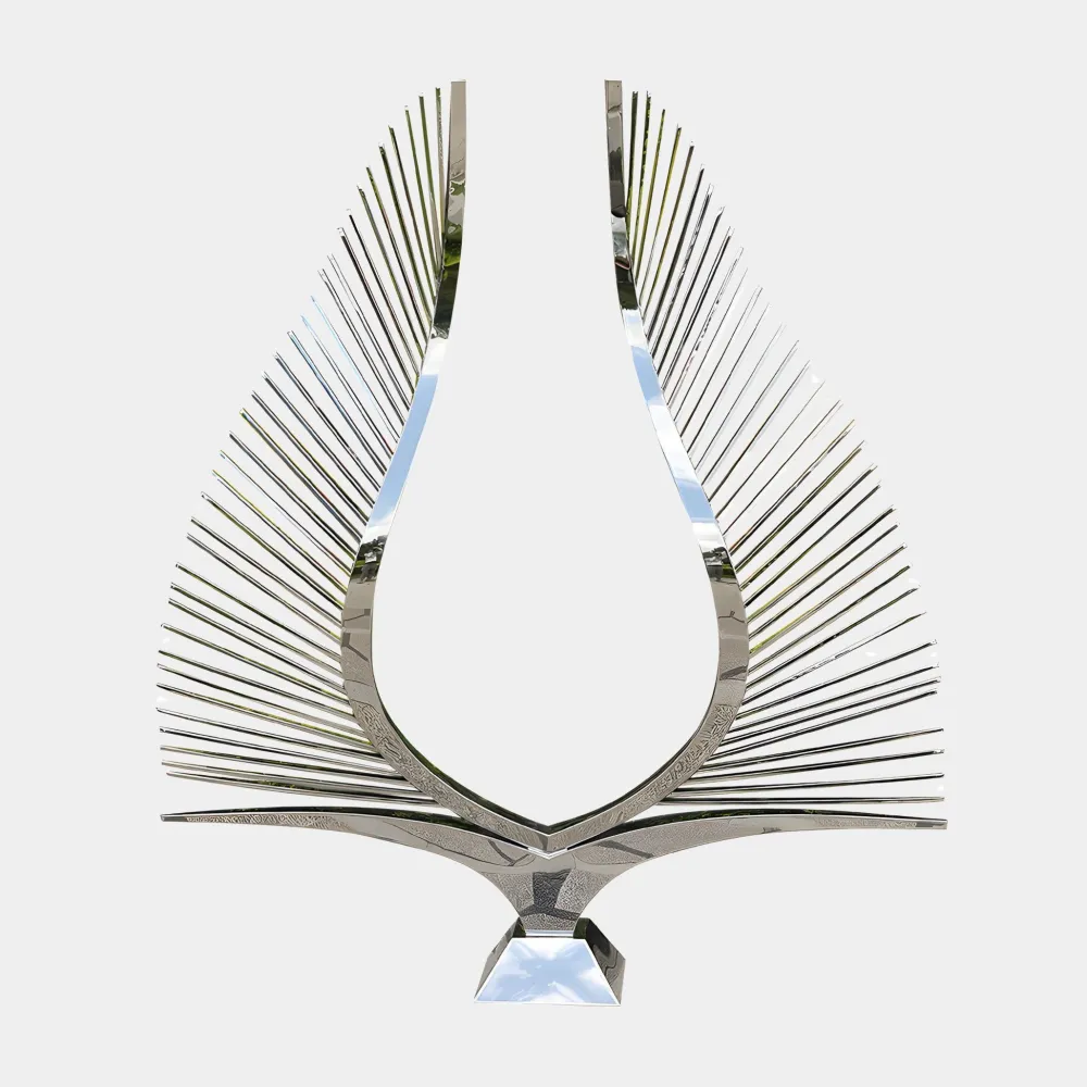 Transform any outdoor space with the Harmonic Wings Sculpture, a captivating blend of modern artistry and celestial symbolism. Crafted from high-quality stainless steel this sculpture features an array of elongated rays extending from a central core representing the radiant energy of the sun and stars. Its polished surface interacts dynamically with natural light reflecting and refracting its surroundings to create an ever-changing visual experience. Designed to be both bold and elegant this piece serves as a striking focal point seamlessly merging contemporary aesthetics with artistic expression.
