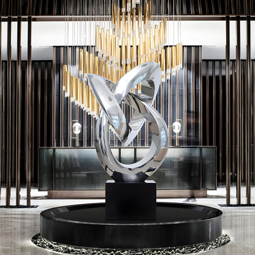 The Infinity Fusion Sculpture is designed to enhance both indoor and outdoor environments with its timeless appeal and durable construction. Its robust stainless steel composition ensures longevity, making it suitable for gardens, patios and landscaped areas where it seamlessly integrates with natural surroundings and architectural features. Indoors, it serves as a sophisticated focal point in living rooms, lobbies or art galleries complementing styles ranging from minimalist to contemporary.