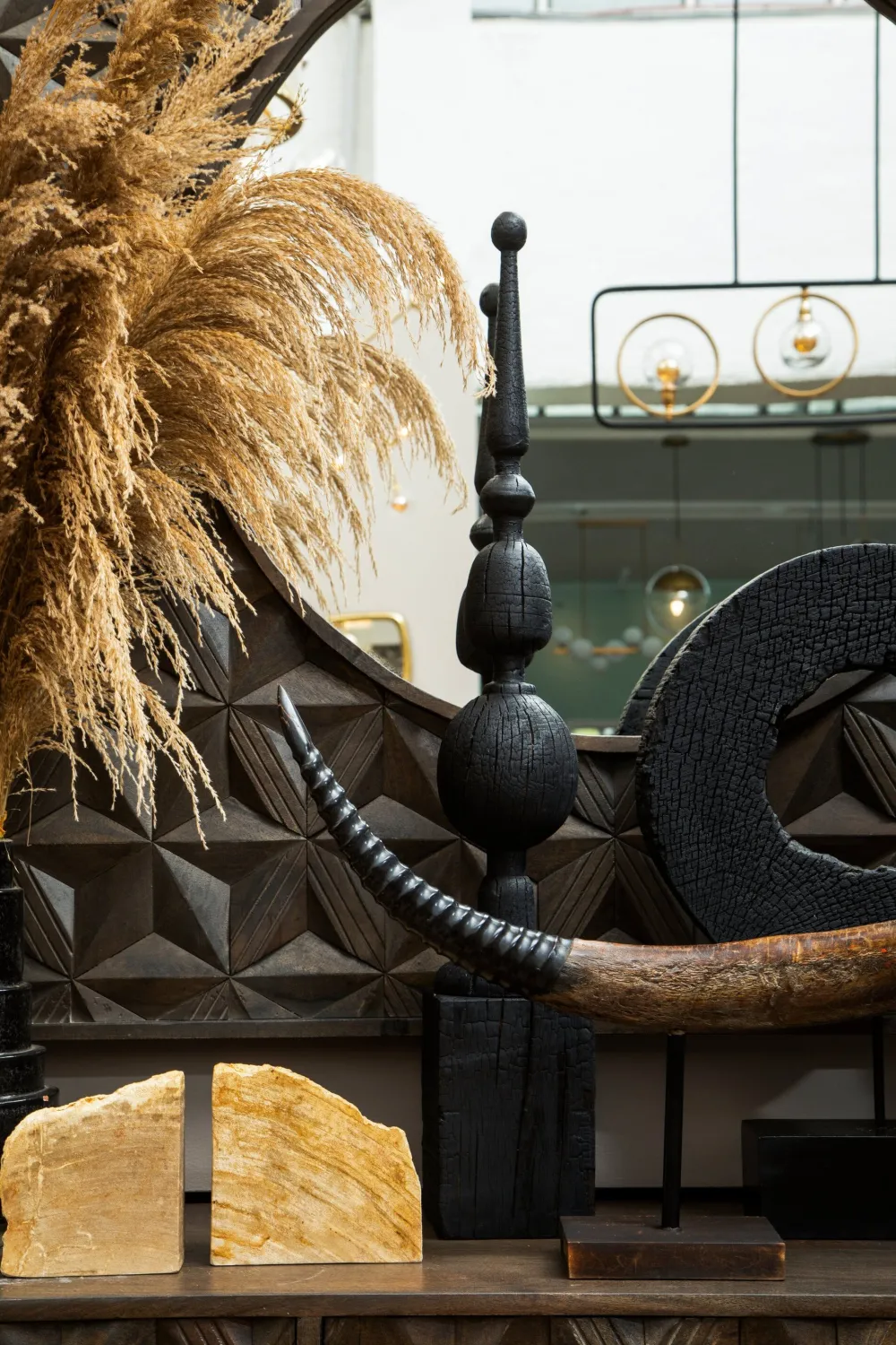 Overview: Outstanding in style this home decor sculpture is perfect as a centrepiece in the modern home. This sculpture is finished in wonderfully sleek charred jet black and when viewed closely you will see the marks of handcraft and individualities of every piece.