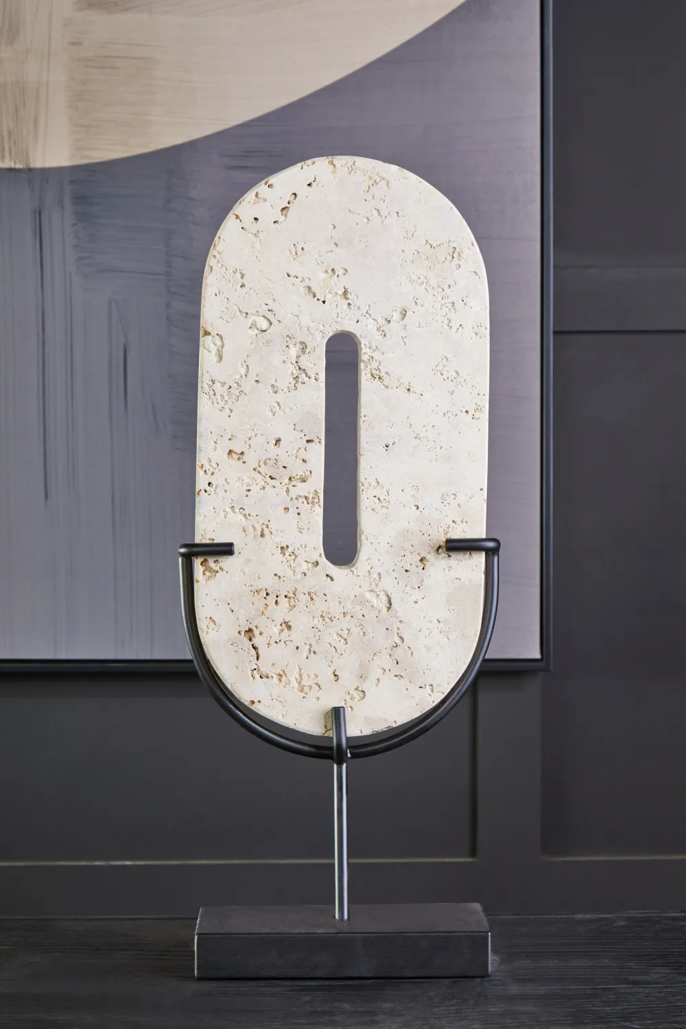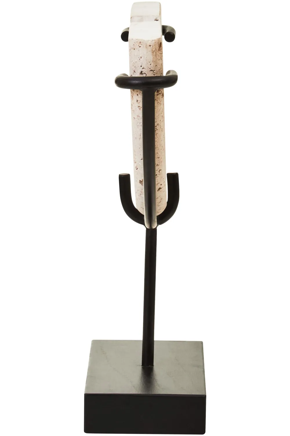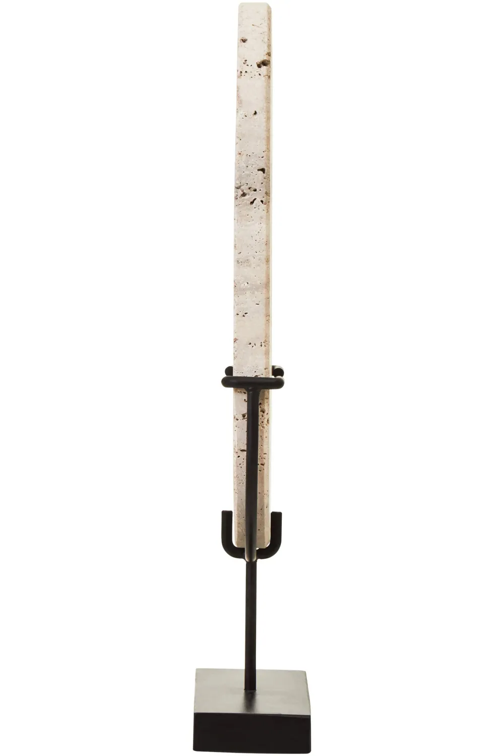 - Material: Natural Travertine Stone Sculpture / Acacia Wood Base / Iron Stem
