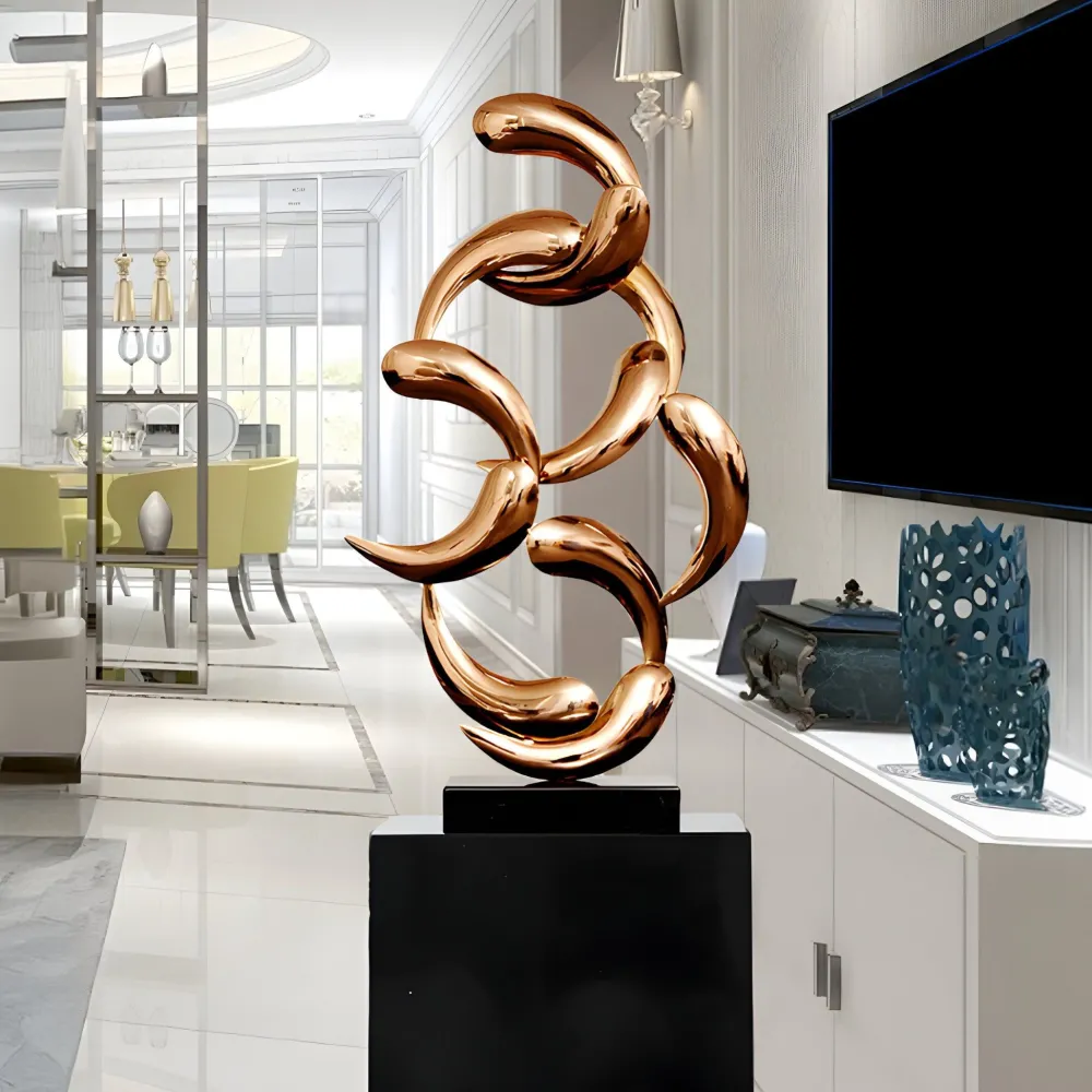 The Aero Stream Sculpture is a stunning embodiment of contemporary artistry designed to captivate with its fluid form and refined aesthetic. Expertly crafted from high-grade stainless steel, it features a striking bronze-toned finish that enhances its sophisticated presence. The sculpture’s interwoven shapes create a sense of movement and balance making it a dynamic focal point in any environment. Supported by a sleek black base, it exudes both stability and elegance, allowing its intricate design to stand out beautifully.