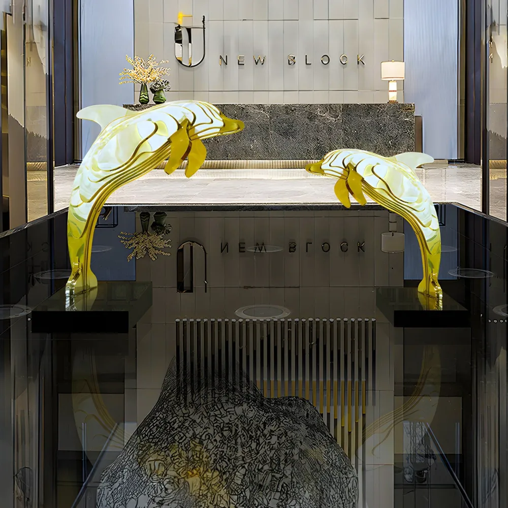 The Aqua Dolphin Stainless Steel Sculpture embodies the elegance and movement of marine life in a sleek modern design. Crafted from high-quality stainless steel with a radiant finish it captures the essence of a dolphin in motion. The layered structure creates a sense of fluidity, mimicking the natural leap of a dolphin through water. Its polished surface interacts beautifully with light producing dynamic reflections that enhance its sculptural appeal. Whether viewed from up close or at a distance the intricate details and flowing lines make it a captivating work of art.