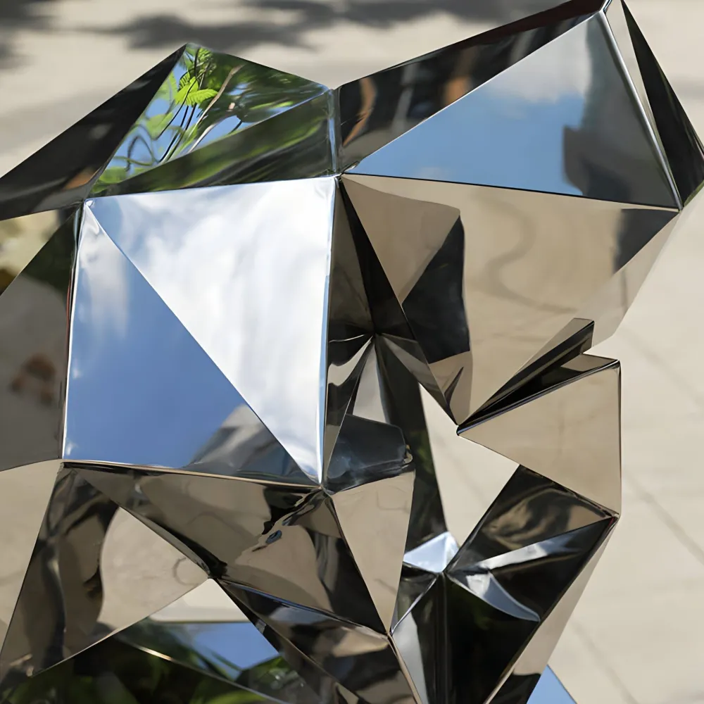 Introducing a captivating masterpiece of modern design: The Thinker Sculpture showcases a mesmerising interplay of interlocking forms and reflective surfaces. Meticulously crafted from high-grade stainless steel, the sculpture combines sharp angular facets with fluid curves, resulting in a harmonious yet abstract composition. Its polished finish amplifies its reflective qualities, creating a dynamic interaction with light that transforms as you view it from different angles. More than a decorative object, this piece is a statement of contemporary elegance serving as a focal point that adds depth and sophistication to any space.
