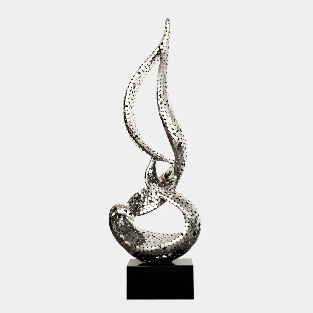 Introducing the Eternal Flame Stainless Steel Sculpture: a perfect fusion of modern elegance and artistic expression. Its abstract form combines sharp angles with flowing curves, creating a visually dynamic piece that captivates from every perspective. Crafted from high-quality stainless steel with a polished finish, this sculpture reflects light beautifully, enhancing its surroundings and inviting viewers to explore its intricate design. Its contemporary aesthetic makes it an eye-catching centerpiece in any environment.