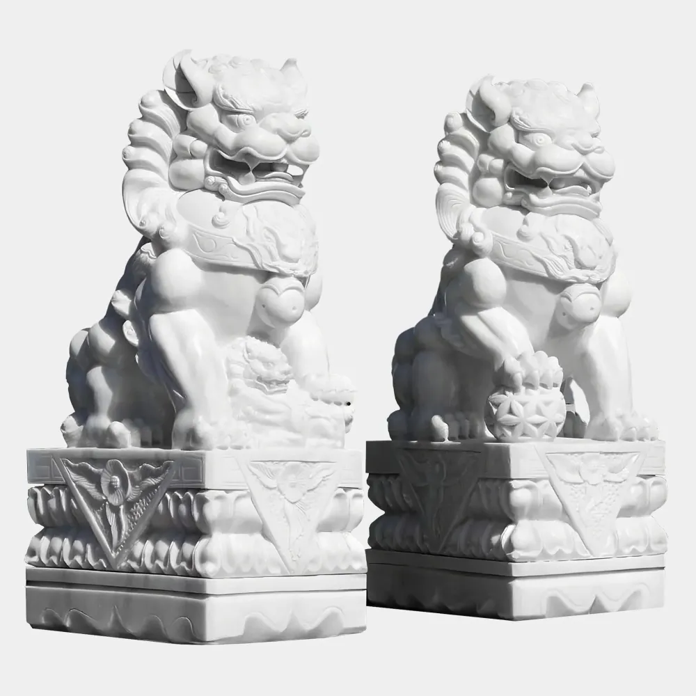 The Foo Dog Statues are a masterful blend of traditional symbolism and contemporary craftsmanship. Hand-carved from premium natural white marble these powerful guardians stand on top of an intricately designed pedestal embodying strength, wisdom and protection. Every detail from the expressive eyes and flowing mane to the poised stance and ornate patterns on the base is meticulously sculpted by skilled artisans. The pristine white marble enhances its regal presence while the natural veining adds depth and individuality making each statue unique. These guardian Foo Dog Statues serve not only as a striking visual statement but also as a meaningful representation of cultural heritage offering an enduring sense of security and prestige.