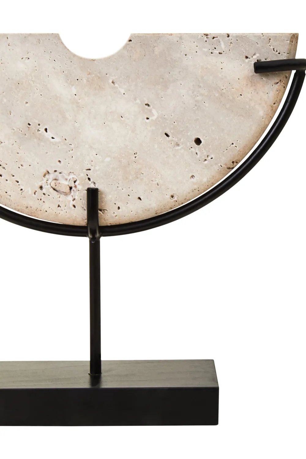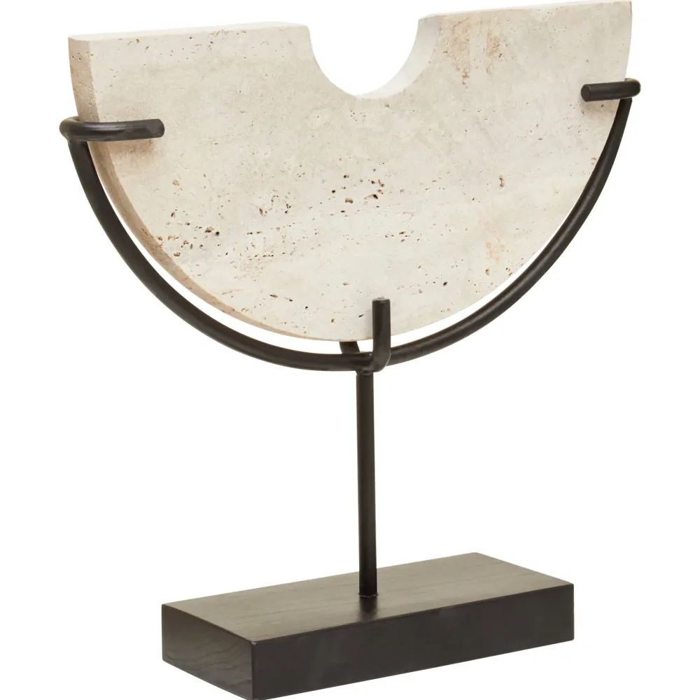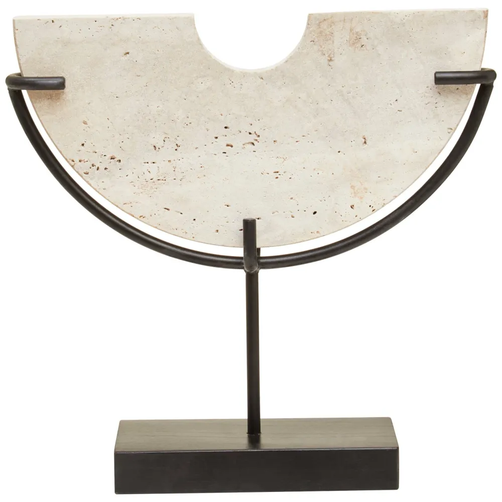 - Material: Natural Travertine Stone Sculpture / Acacia Wood Base / Iron Stem