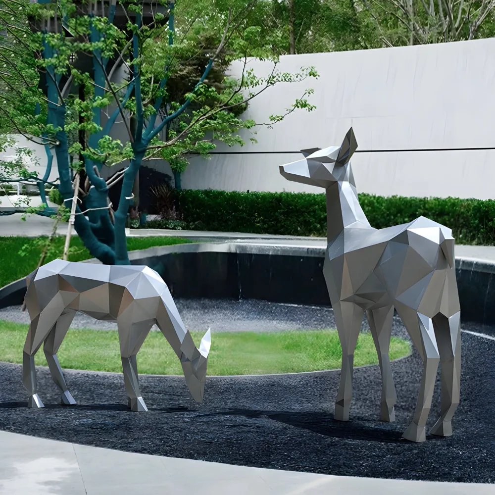 The Deer Geometric Sculpture is an exceptional masterpiece that seamlessly blends modern artistry with the raw untamed essence of wildlife. Meticulously crafted from premium stainless steel, this sculpture reinterprets the iconic rhinoceros through sharp angular facets and clean geometric lines. The surface adds a sleek contemporary finish that beautifully reflects natural light, making the piece appear dynamic and ever-changing throughout the day. This bold artwork captures the rhino’s strength and resilience, offering a compelling visual statement that enhances any outdoor setting.